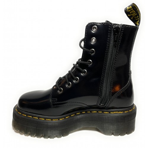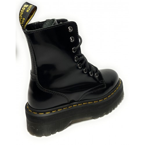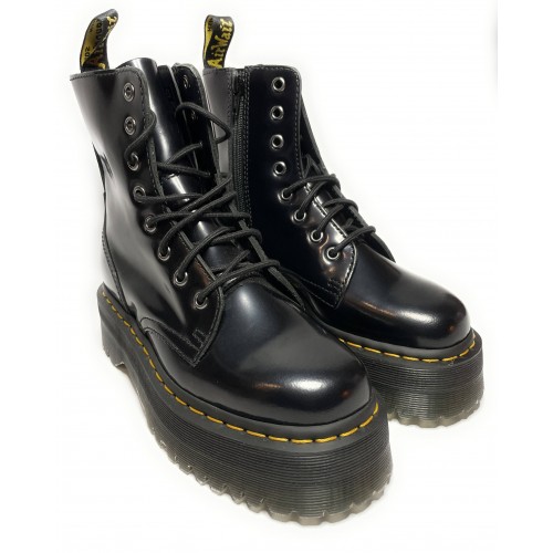 Scarpe da donna Dr.Martensmodello Anfibio con fondo fusbet alto(Jadon)in pellecolore nero, cucitura gialla.Cerniera laterale disposta sulla parte interna della scarpa.Tacco: 5,00cmPlateau: 3,50cm