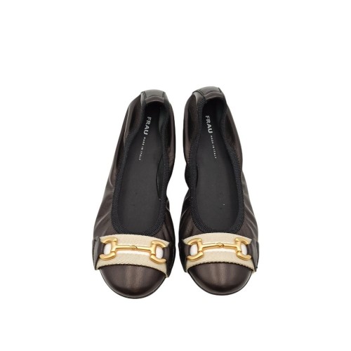La ballerina in pelle nera Frau, modello 70M4 Impero Nero, è un'opzione semplice ed elegante per ogni occasione. Realizzata in morbida pelle, la tomaia è sfoderata per offrire comfort e flessibilità. Il dettaglio distintivo di questa ballerina è il morsetto in metallo gommato ton sur ton, sovrapposto a un inserto in tessuto, che conferisce un tocco di raffinatezza al design. Il profilo elasticizzato in gros grain assicura una calzata comoda e aderente. La presenza di una zeppetta interna aumenta ulteriormente il comfort durante l'uso. Il sottopiede rivestito in pelle offre una sensazione di morbidezza sotto il piede, mentre la suola nera in TPU garantisce resistenza e durata. Questa ballerina è un'ottima scelta per chi cerca un mix perfetto di stile e comfort.