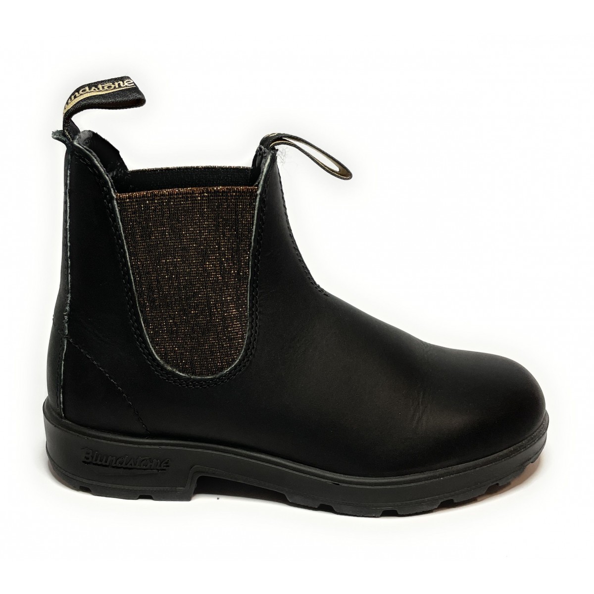 Scarpe da donnaBlundstone modello beatlesin pellecolore neroconelastico marrone glitterato.All'interno soletta termica, fondo in gomma.