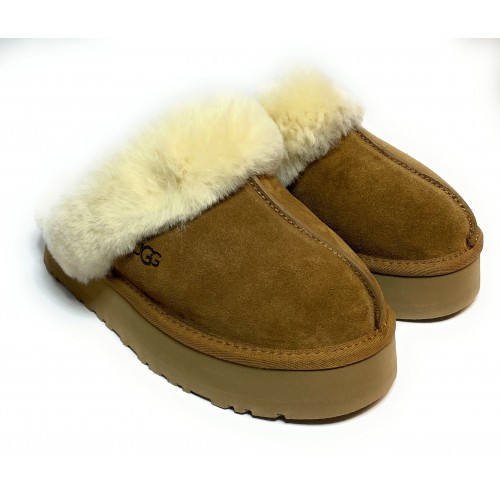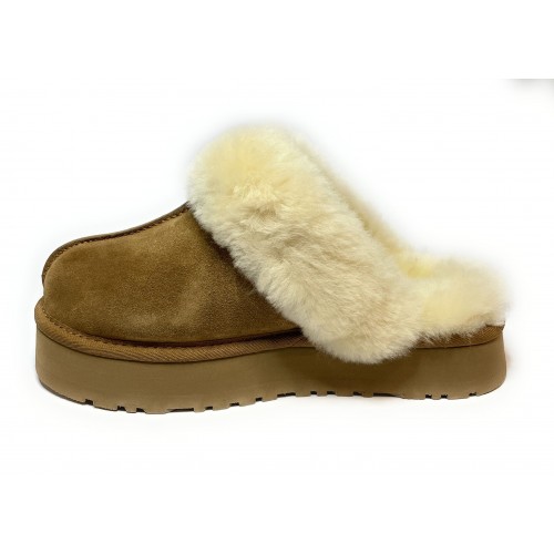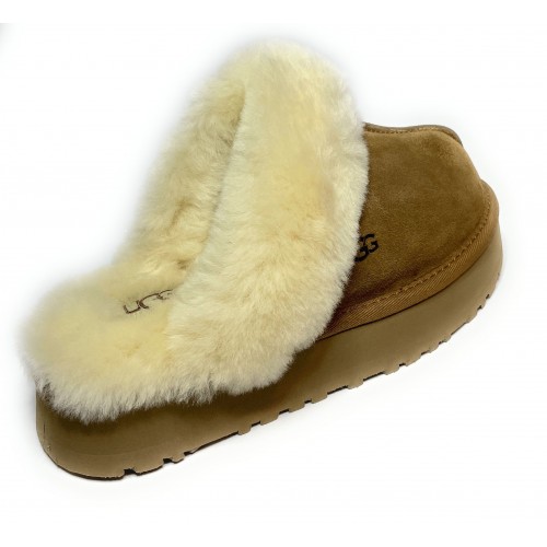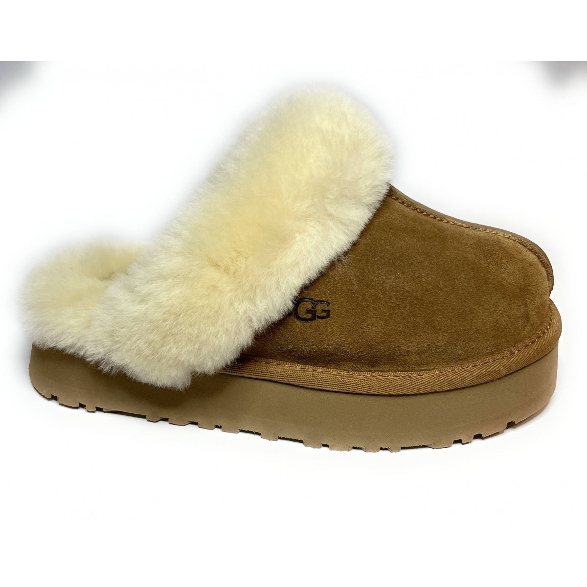 Scarpe da donna Uggmodello pantofola in vera pelle di montone di colore chestnut.Interno rivestito in pelle (pelliccia) di montone colore bianco.Fondo in gomma.